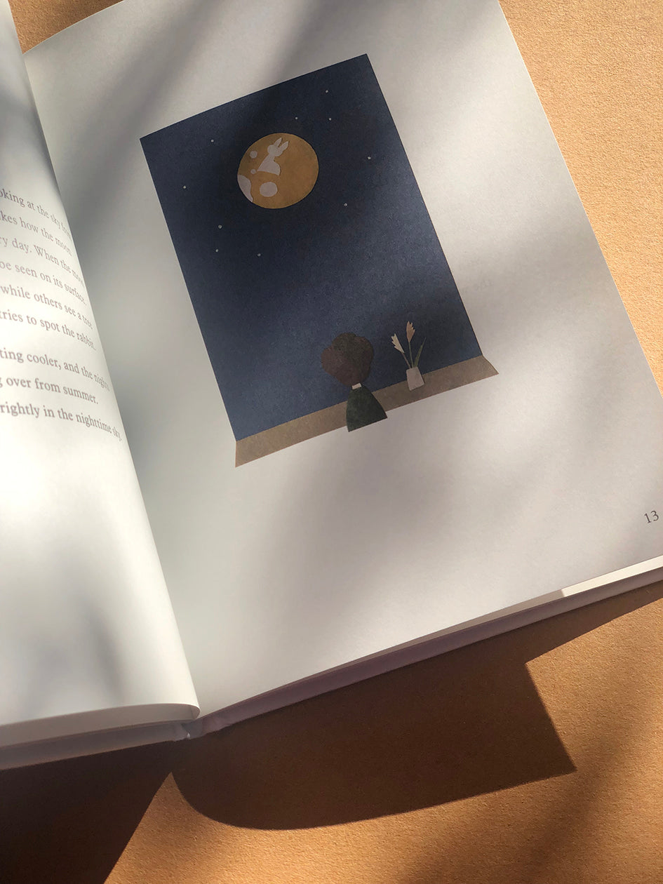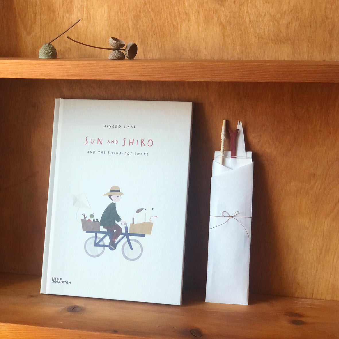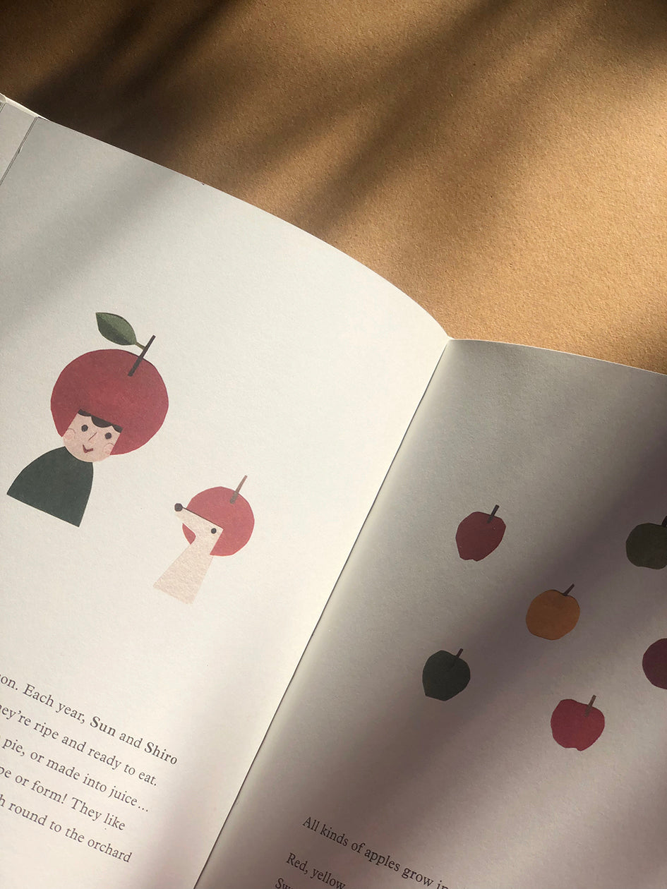 Sun and his white-tailed dog Shiro love spending their days outdoors, exploring nature together. Every year, they look forward to early fall, when they go on leaf hunts together in the woods, collecting them in all sorts of colours, and when the apples in the orchard near their house are ripe.